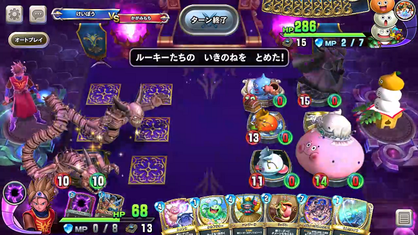 また、スライムかがみもちのカードも早速採用しています。これは、死亡時に味方リーダーのHP10回復と2枚ドローという優秀な能力を持っています。ドローはもちろんのこと、HP10回復の効果もスコアアップのために重要になりますので、採用しない理由がありません。Lv20に挑戦する頃には交換所で3枚交換することができますので、是非とも入手しましょう。今後の試練の間ボスとのバトルでも活躍が期待できるカードです。
